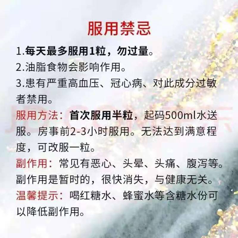 使用说明:提前1.5小时服用,首次服用建议服用半颗。多喝水(红糖水)可缓解副作用,24h内不可服用超过一颗。